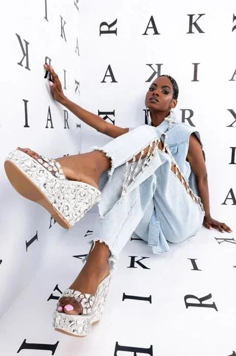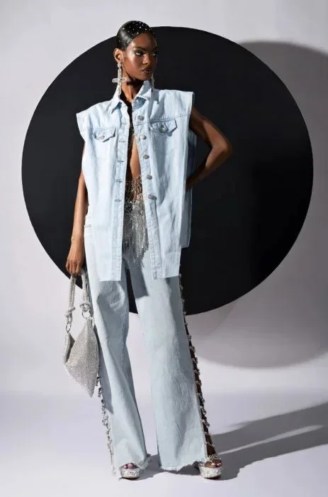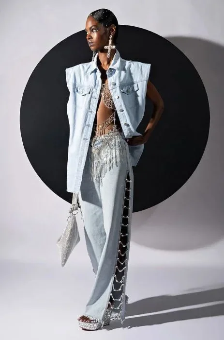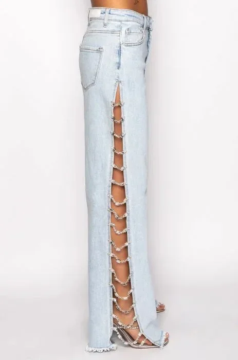 Women Denim Long Jeans with Drill Chains Straight Wide-leg Jeans High Waist Ripped Jeans for Women Summer Thin Side Slit Pants