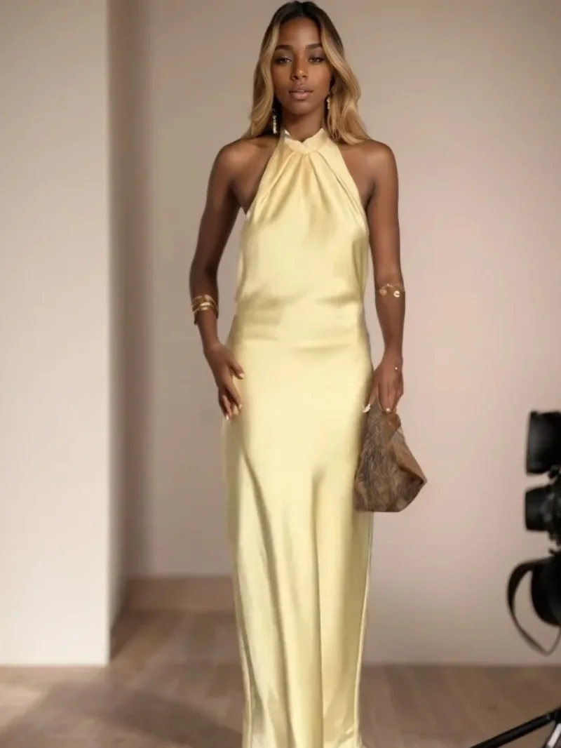 Women Elegant Satin Dress Fashion Lace Up Hanging Collar Long Dresses for Women Solid Sleeveless Midi Dress Lady Evening Dress