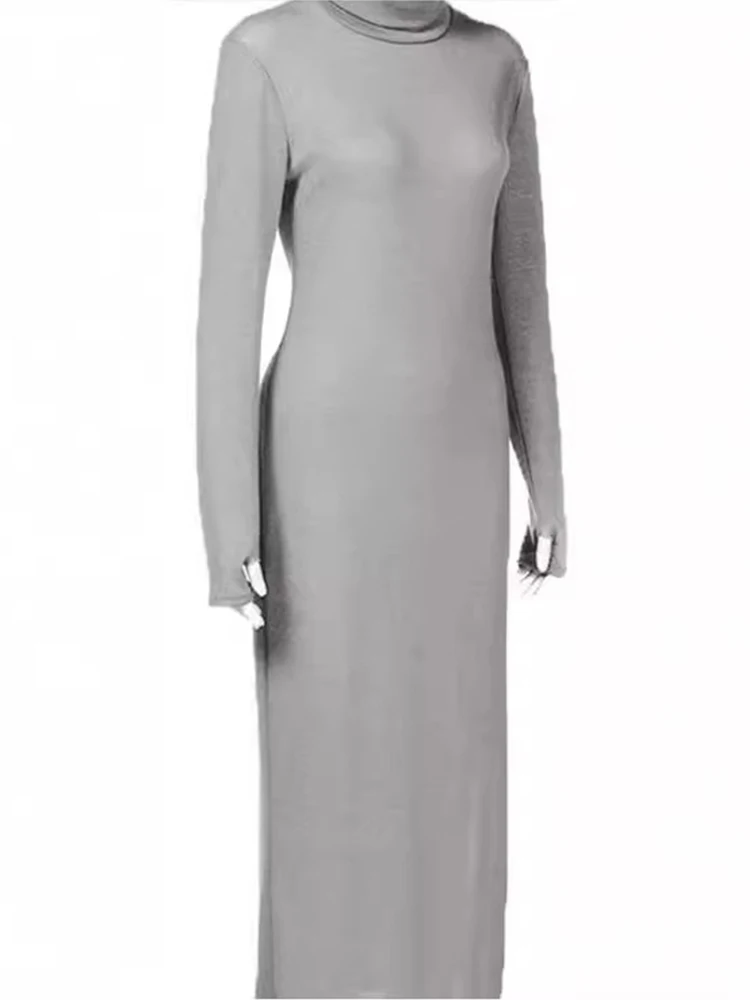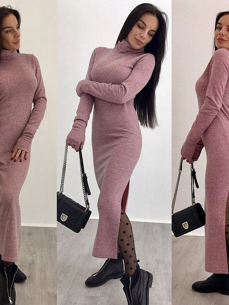 Women Elegant Turtleneck Long Dresses Fashionable Solid Color Long Dresses Slim Fit Sexy Bottom Slit Skirts Spring Autumn New