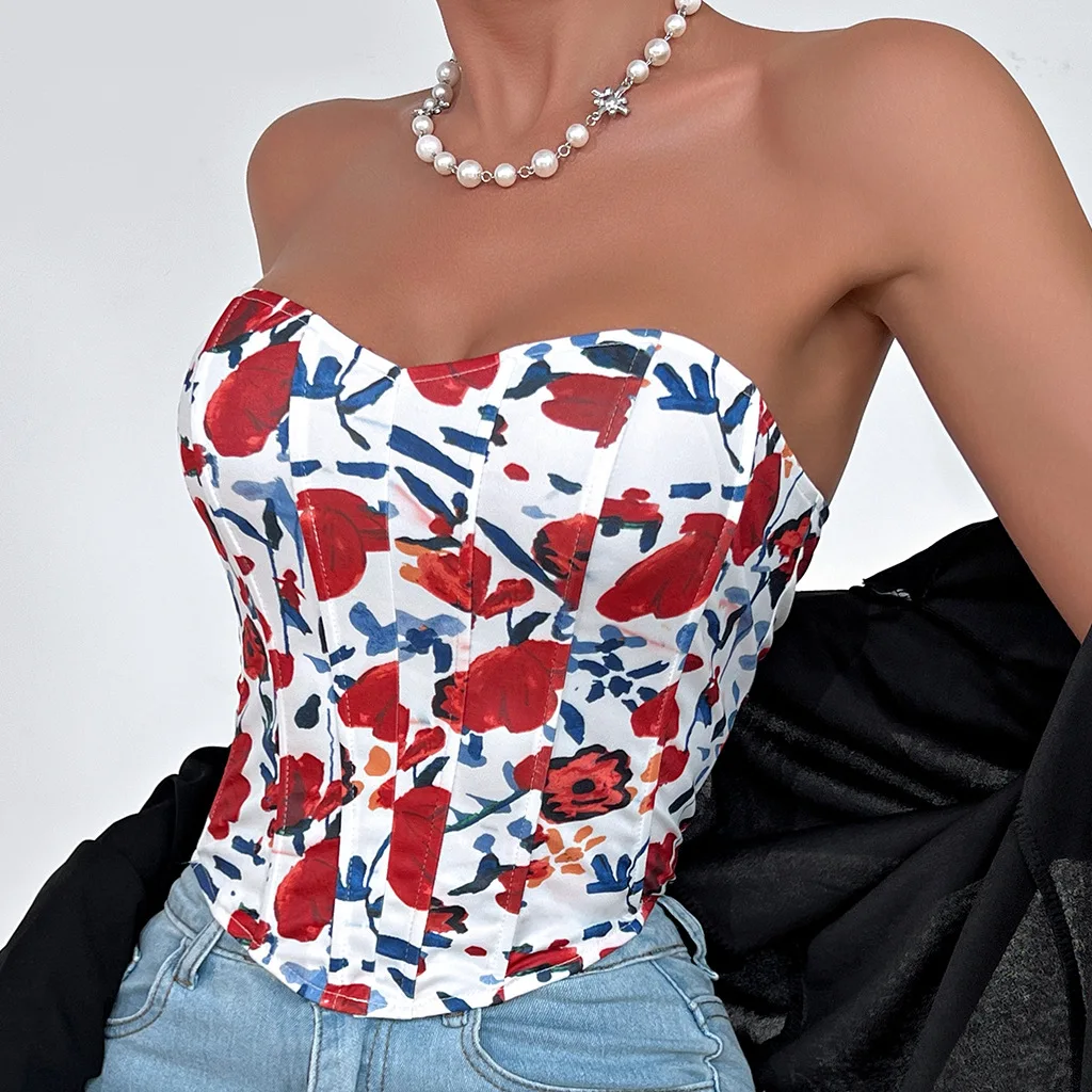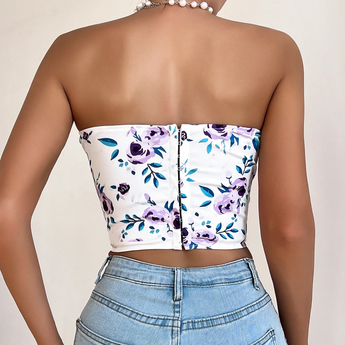 Women Floral Top Sexy Spicy Girl Tank Top Low cut Open Back Flower Wrapped Chest Diamond Fish Bone Strap Waist Vest Tank Top