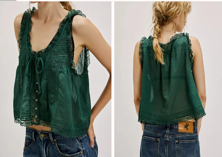 Women Sexy Crop Tops Sleeveless Boho Free Style Tank Tops Splice Lace Hippie Tops Button Down Summer Caimis Tee Top Female Cloth