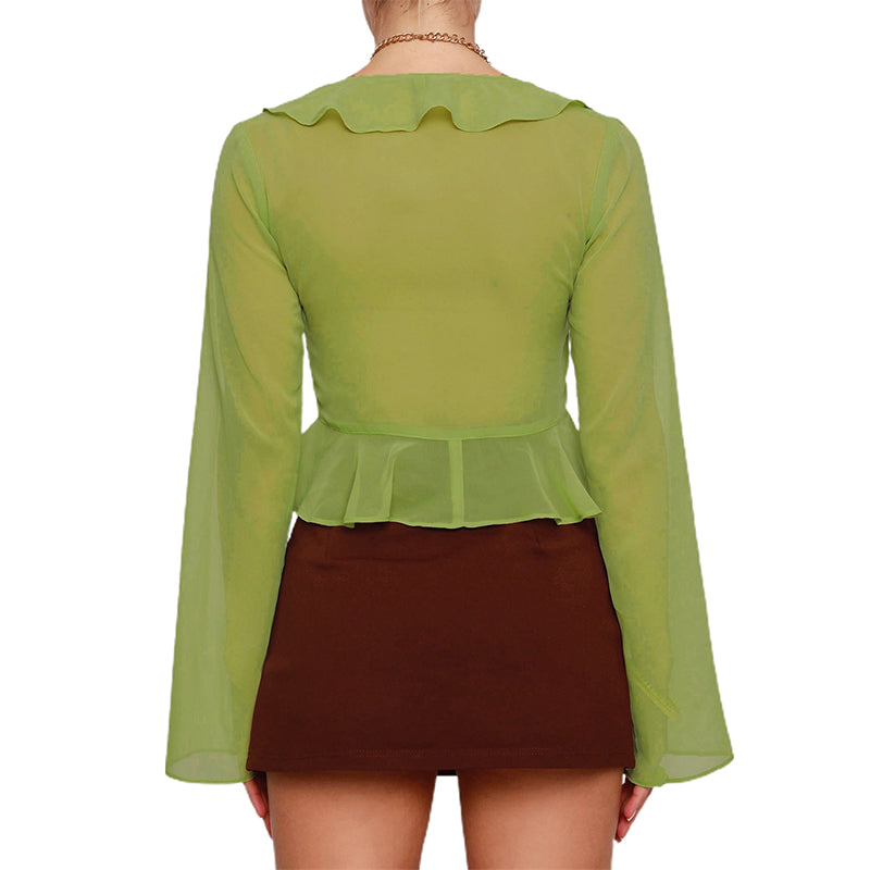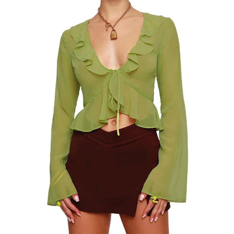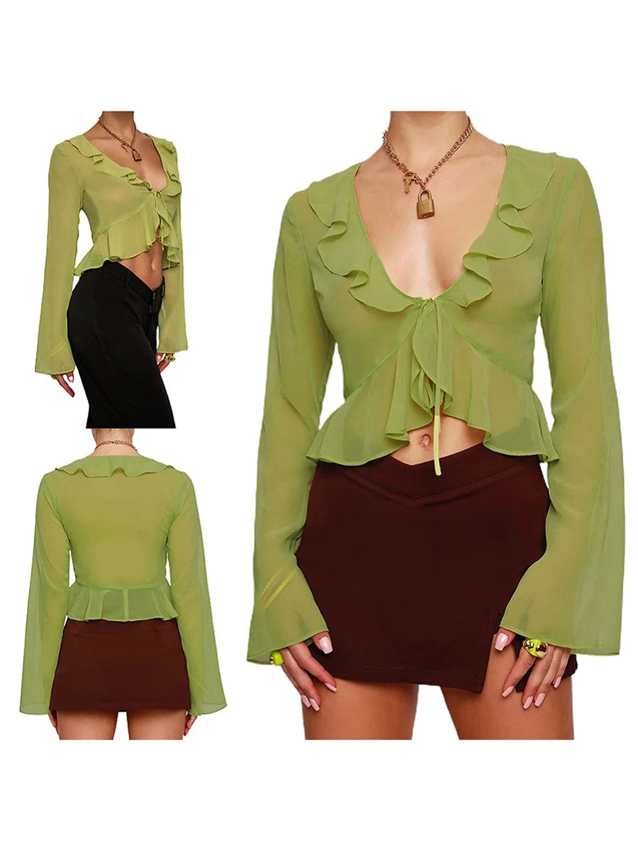 Women Sexy Sheer Crop Tops Pink Long Sleeve Flared Deep V Neck Pleated Hem Tops for Summer Clothing Fairycore Blouse Streetwear