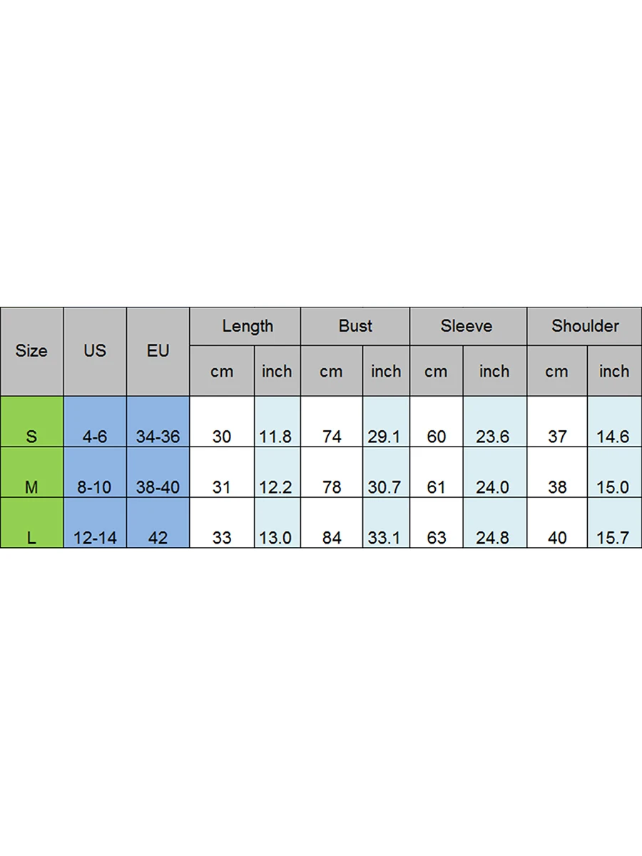 L Length: 12.99 Bust: 33.07 Sleeve: 24.80 Shoulder: 15.75
