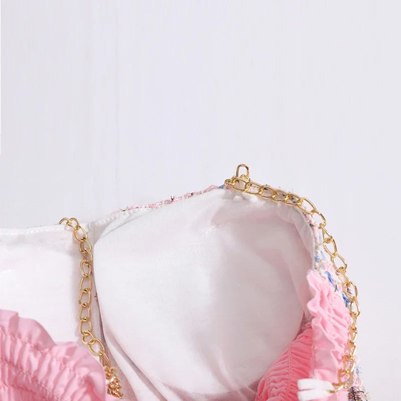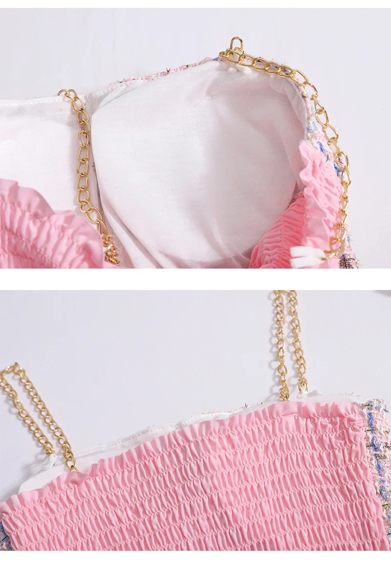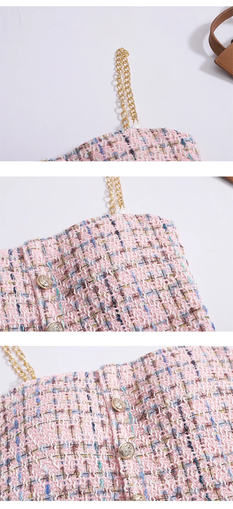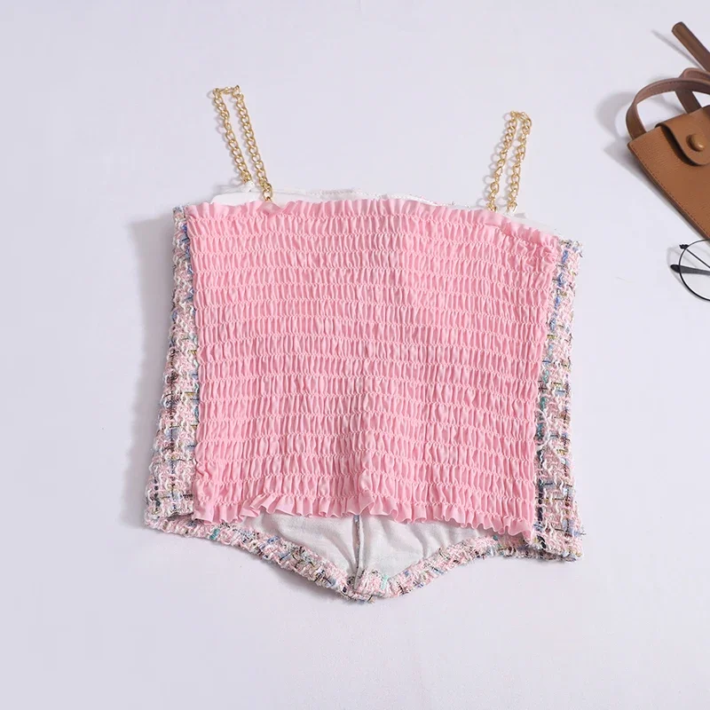 Women Summer Tweed Chain Chic Tank Tops Buttons Off Shoulder with Bra Pad Crop Tops Pleated Sexy Backless Sleeveless Sweet Camis