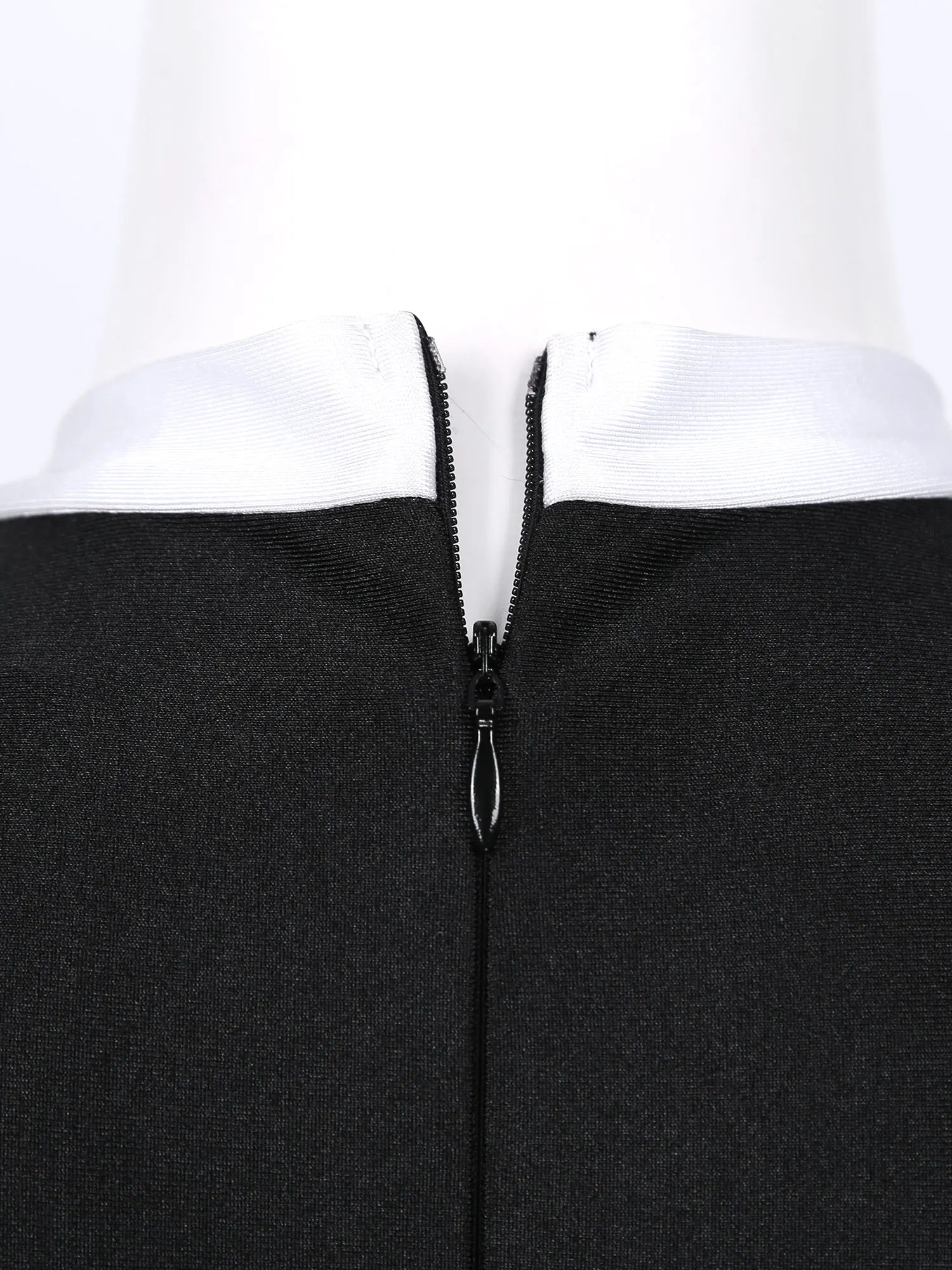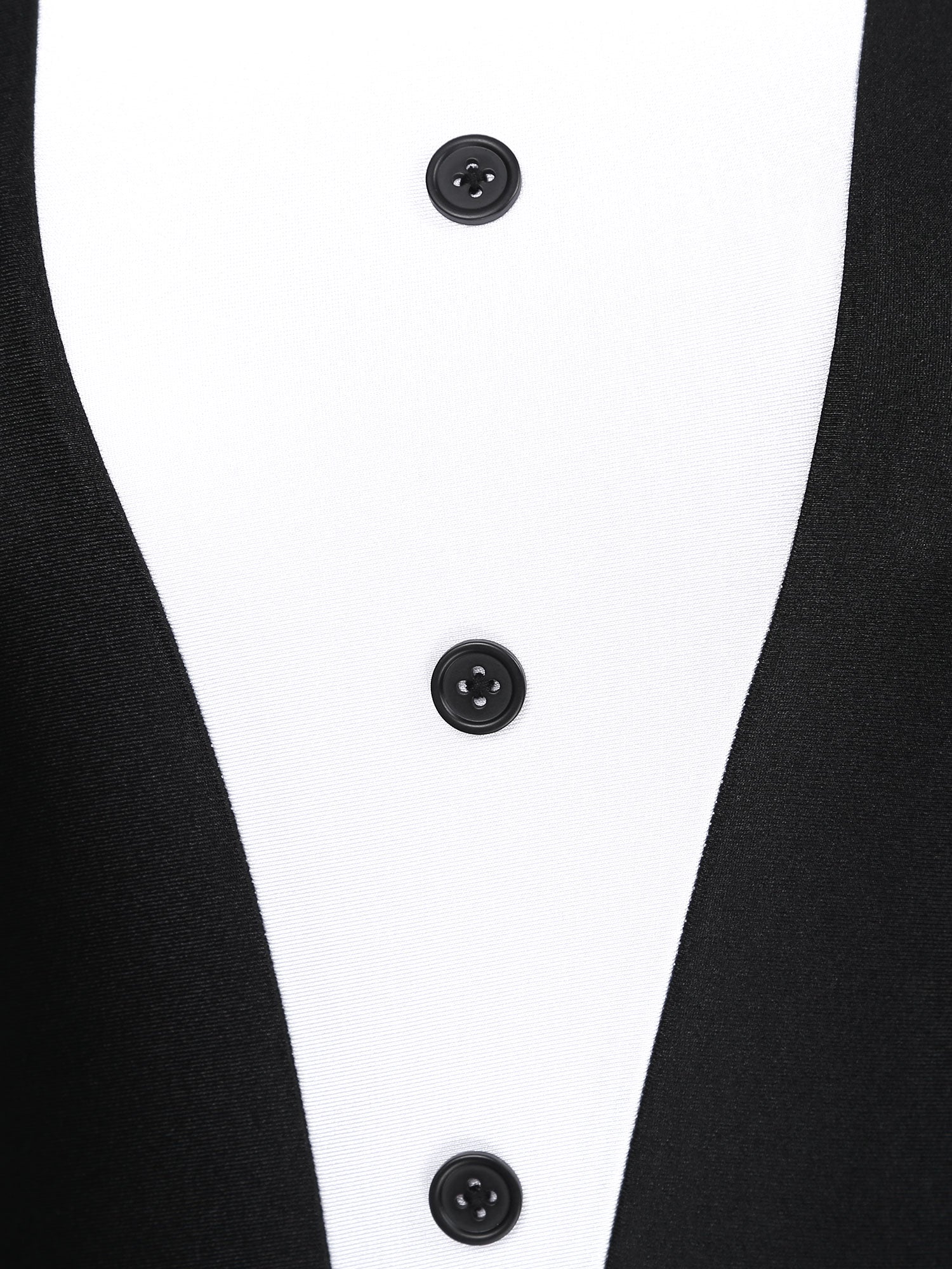 Womens Contrast Color Tuxedo Bowknot Button Long Sleeve Ruffle Dress.