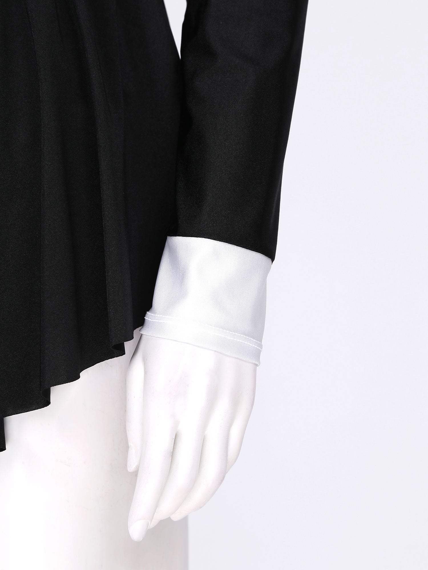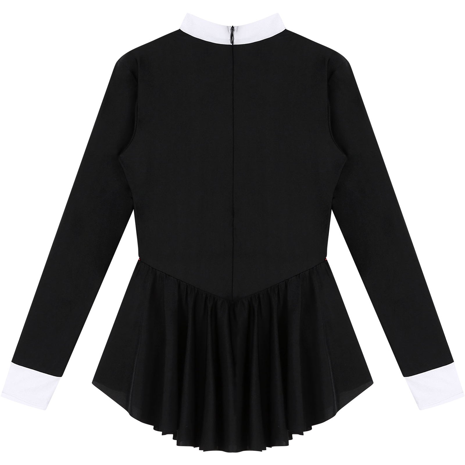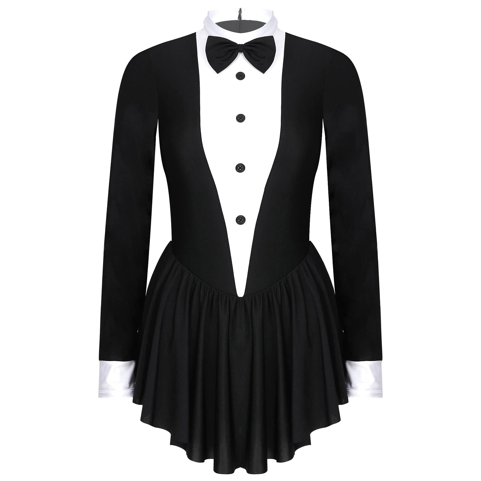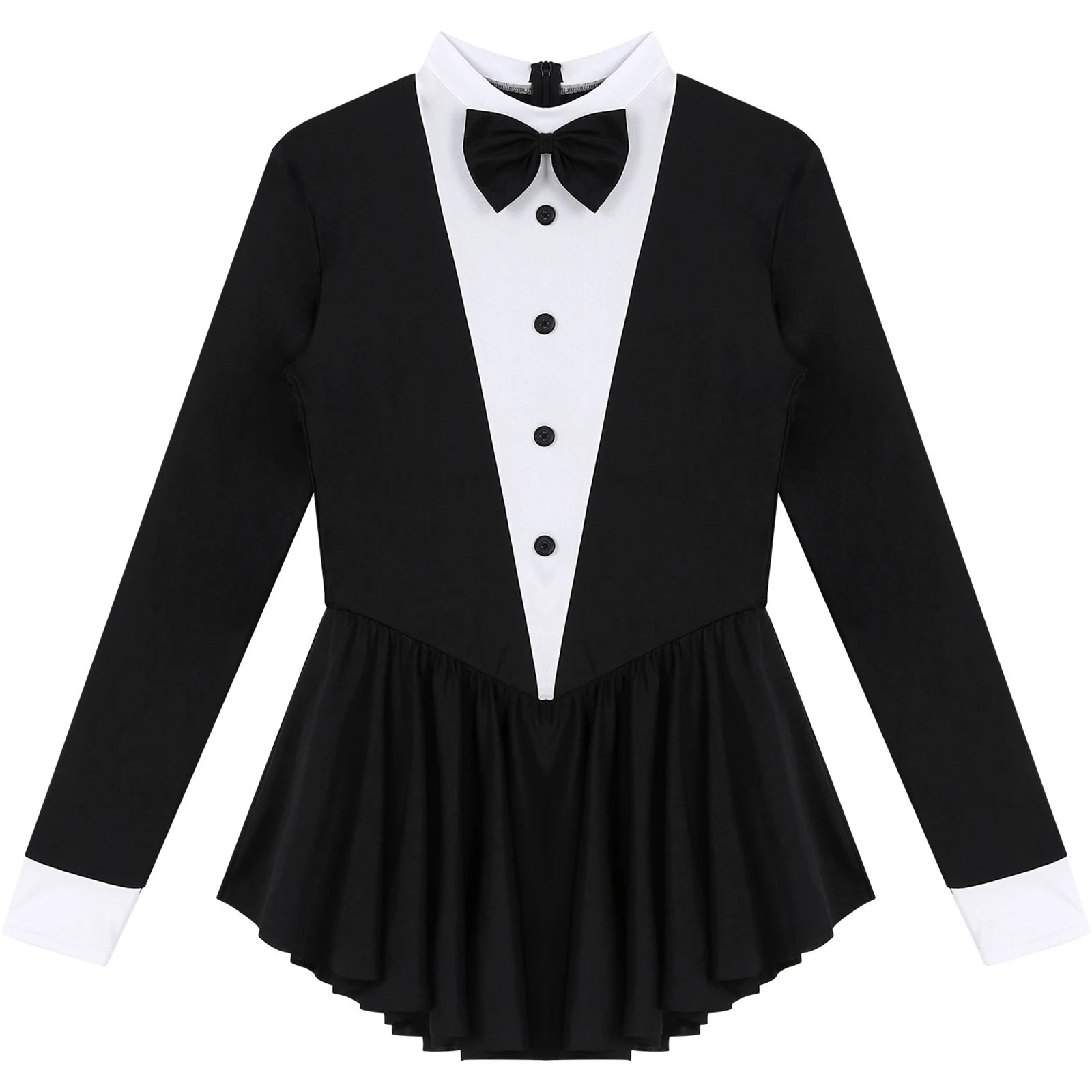 Women Waitress Cosplay Costume Dancewear Long Sleeve Ballroom Latin Dance Dress Bowknot Ruffle Tuxedo Leotard Dresses Clubwear