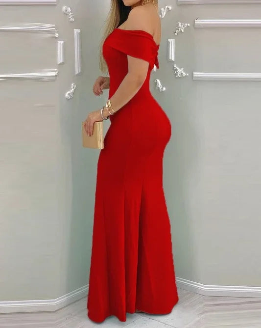 Women's Evening Dress 2025 Spring/summer Red short sleeve Ruffle Hem Bodycon Dress Wrap Hip High Waist Party Tight Maxi Dress