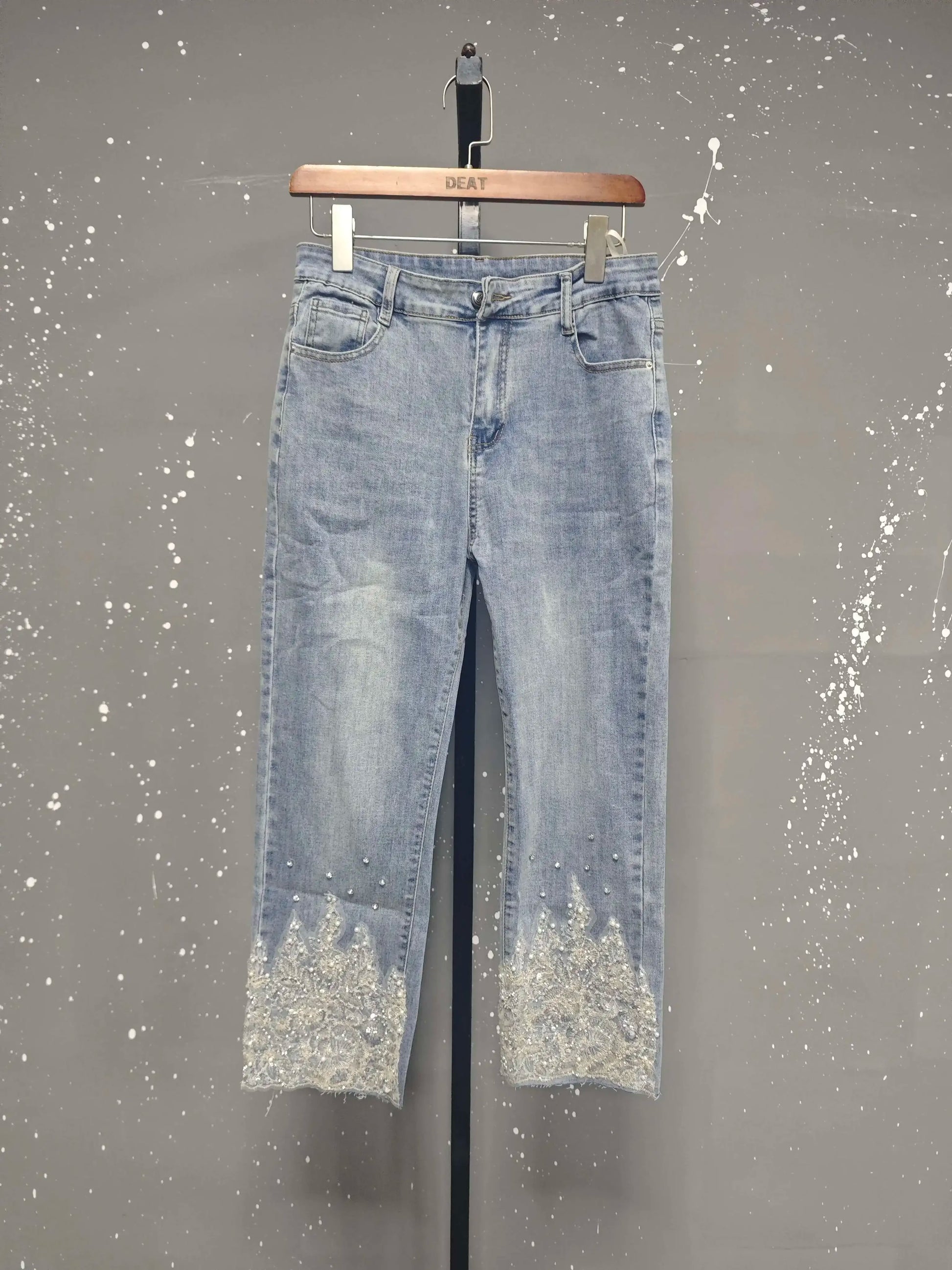 Women's Jeans High Waist Slim Hollow Out Lace Flowers Sequins Stretch Denim Pencil Pants 2025 Summer New Fashion