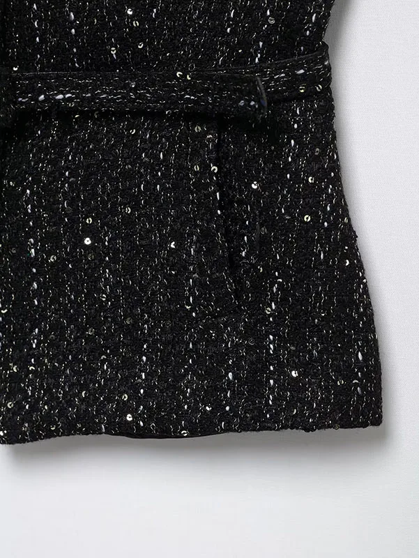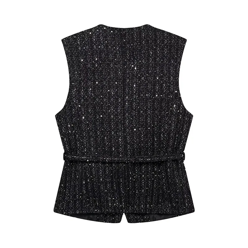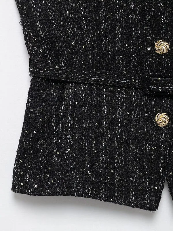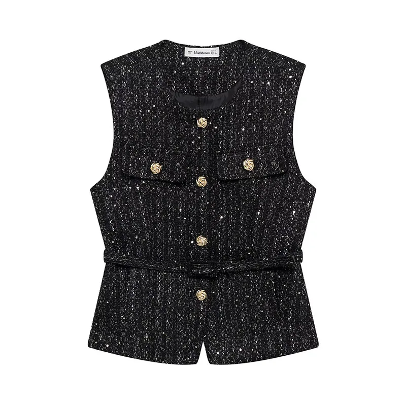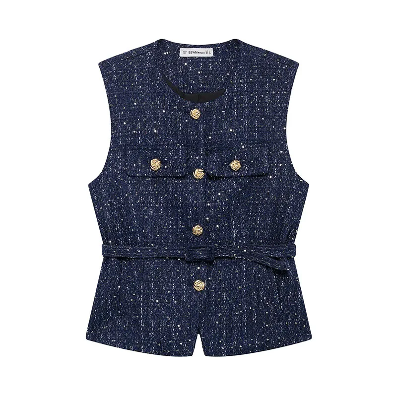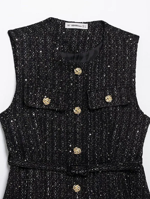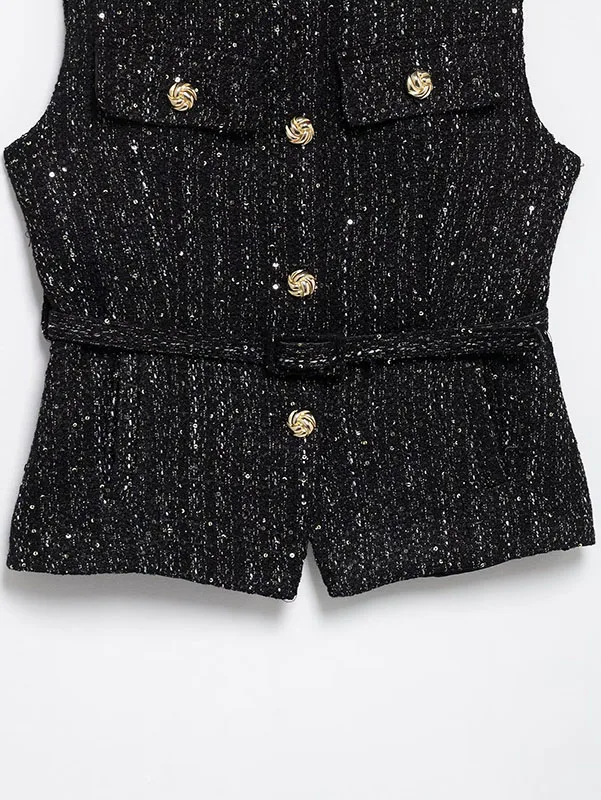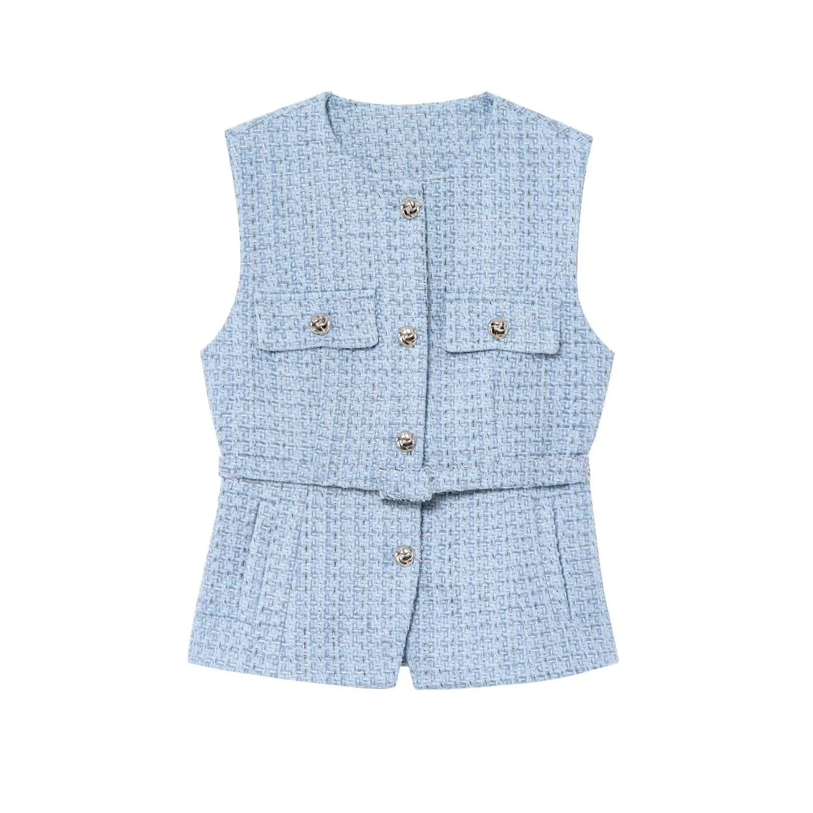 Women's Tweed Waistcoat With Belt, O Neck, Sleeveless, Front Button, Female Outerwear, Chic Tops, Fashion