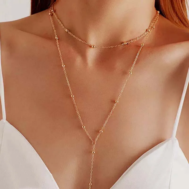 Y-Shaped Round Bead Necklaces for Women Simple Metal Double Laryered Long Chain Drop Pendant Choker Necklaces Fashion Gifts